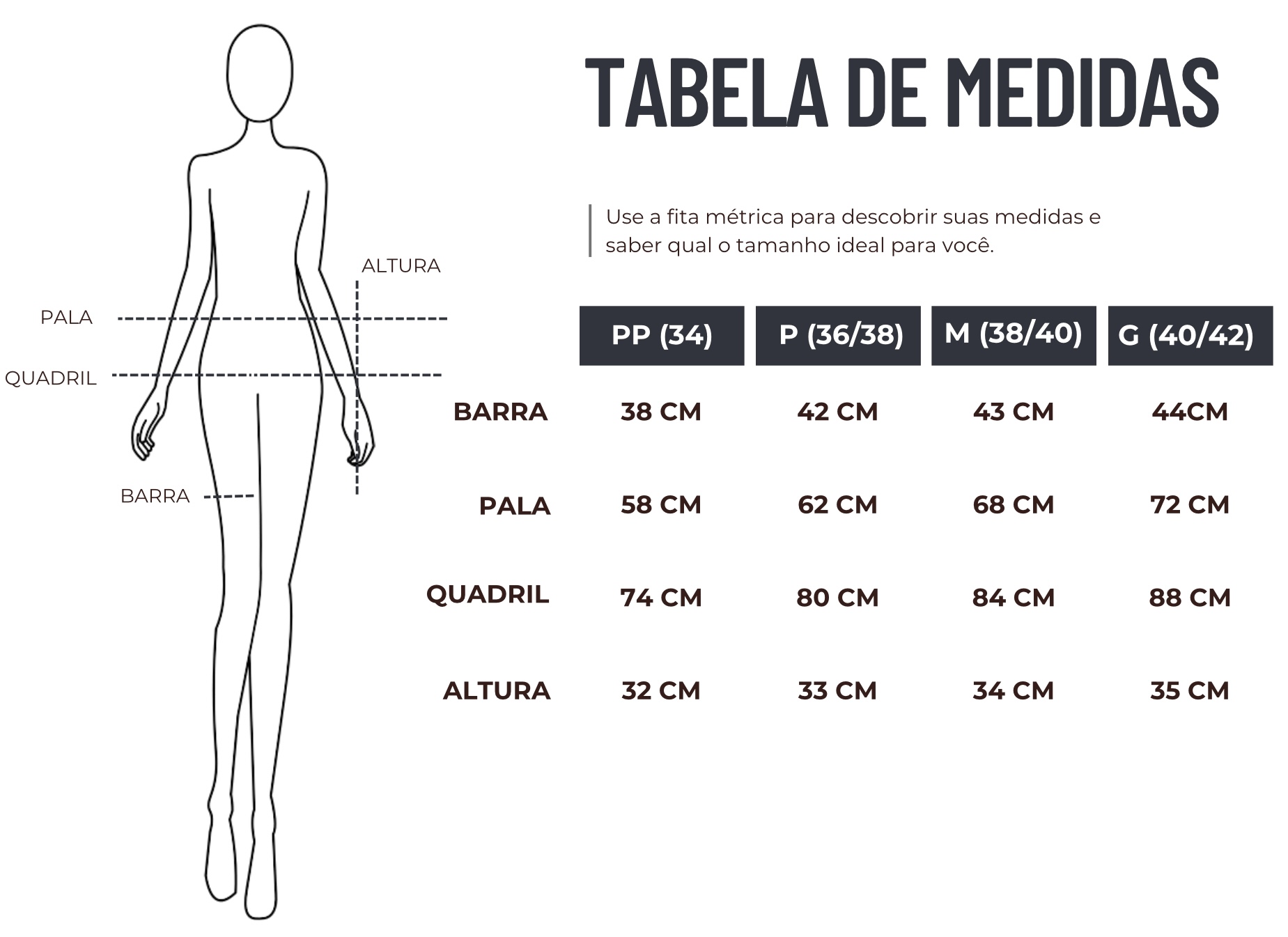 Medidas: modelo veste P, tem 1,75 m de altura, 87 cm de busto, 70 cm de cintura e 94 cm de quadril.