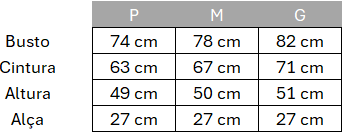 Para a escolha do tamanho ideal, verificar a tabela de medidas abaixo: